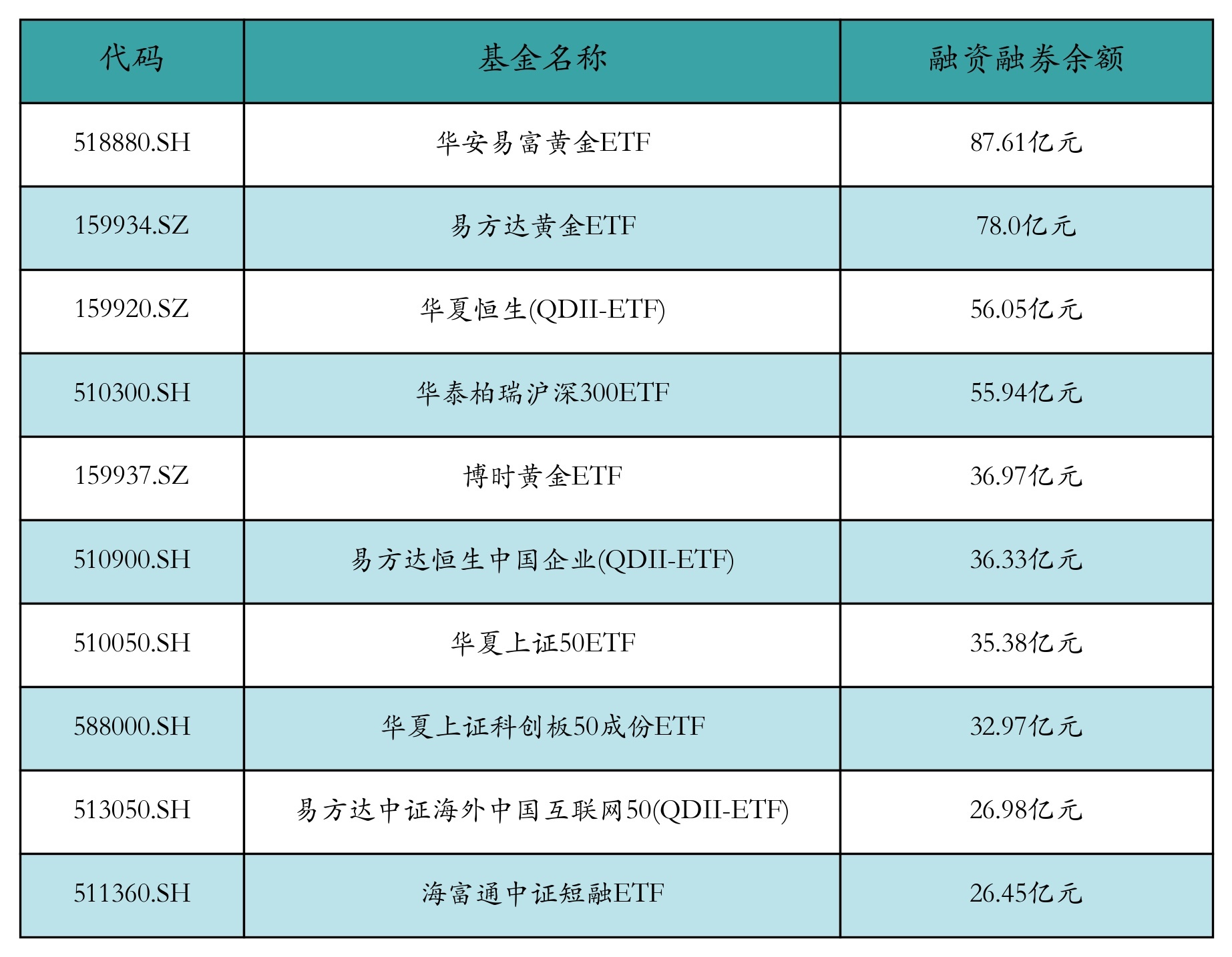 2月20日ETF两融余额前三位分别为:华安易富黄金ETF(87.61亿元)、易方达黄金ETF(78.0亿元)和华夏恒生(QDII-ETF)(56.05亿元),前10具体见下表: