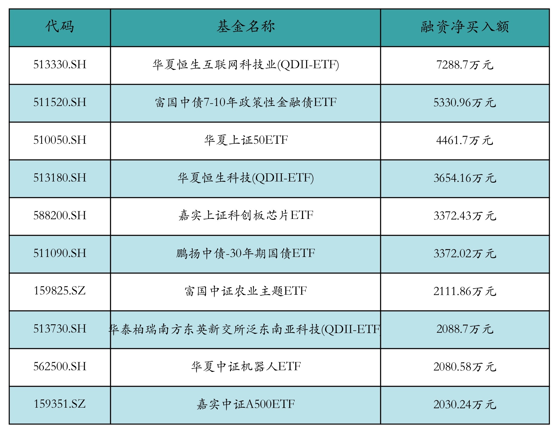 2月20日ETF融资净买入额前三位分别为:华夏恒生互联网科技业(QDII-ETF)(7288.7万元)、富国中债7-10年政策性金融债ETF(5330.96万元)和华夏上证50ETF(4461.7万元),前10具体见下表: