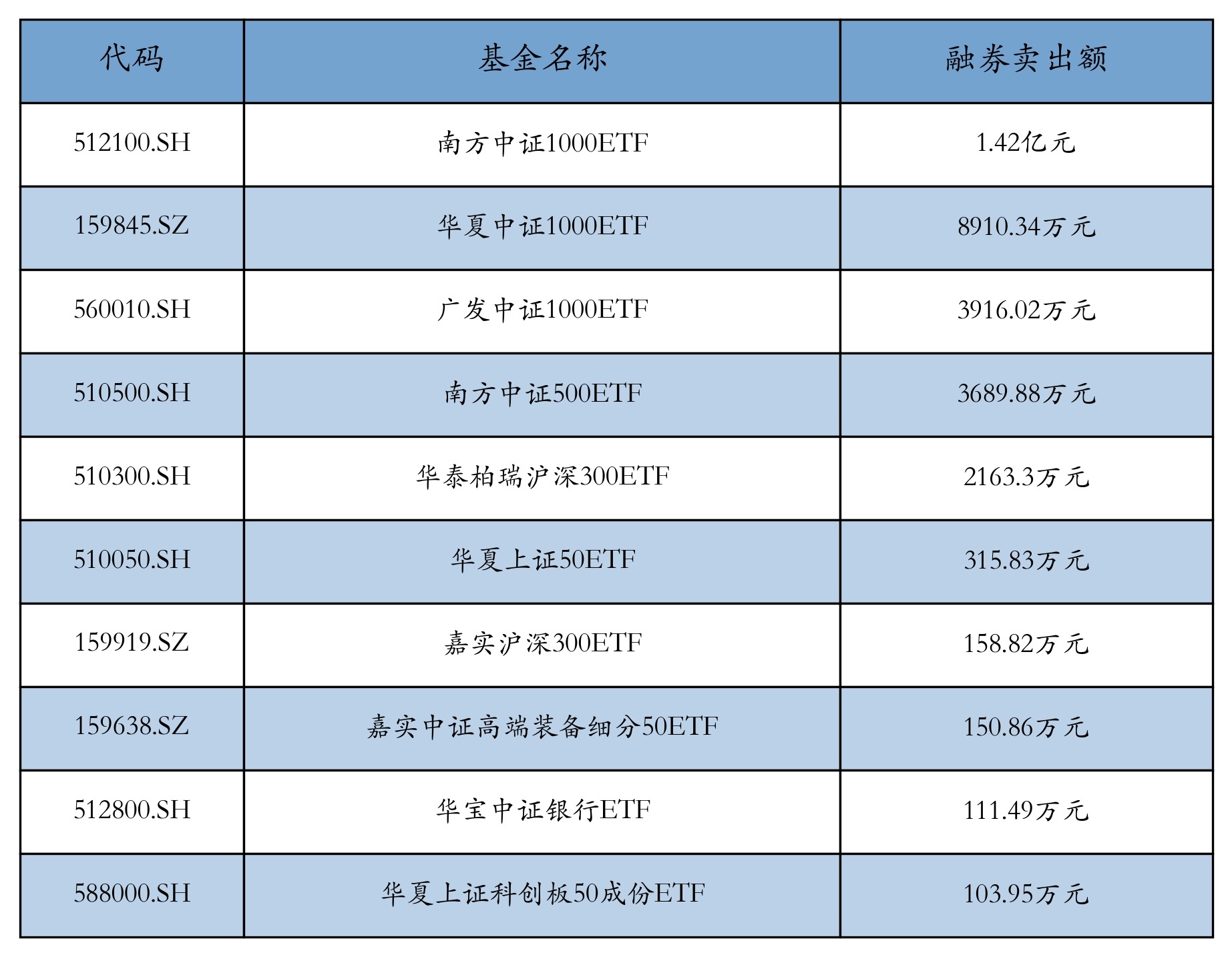 2月20日ETF融券卖出额前三位分别为:南方中证1000ETF(1.42亿元)、华夏中证1000ETF(8910.34万元)和广发中证1000ETF(3916.02万元),前10具体见下表: