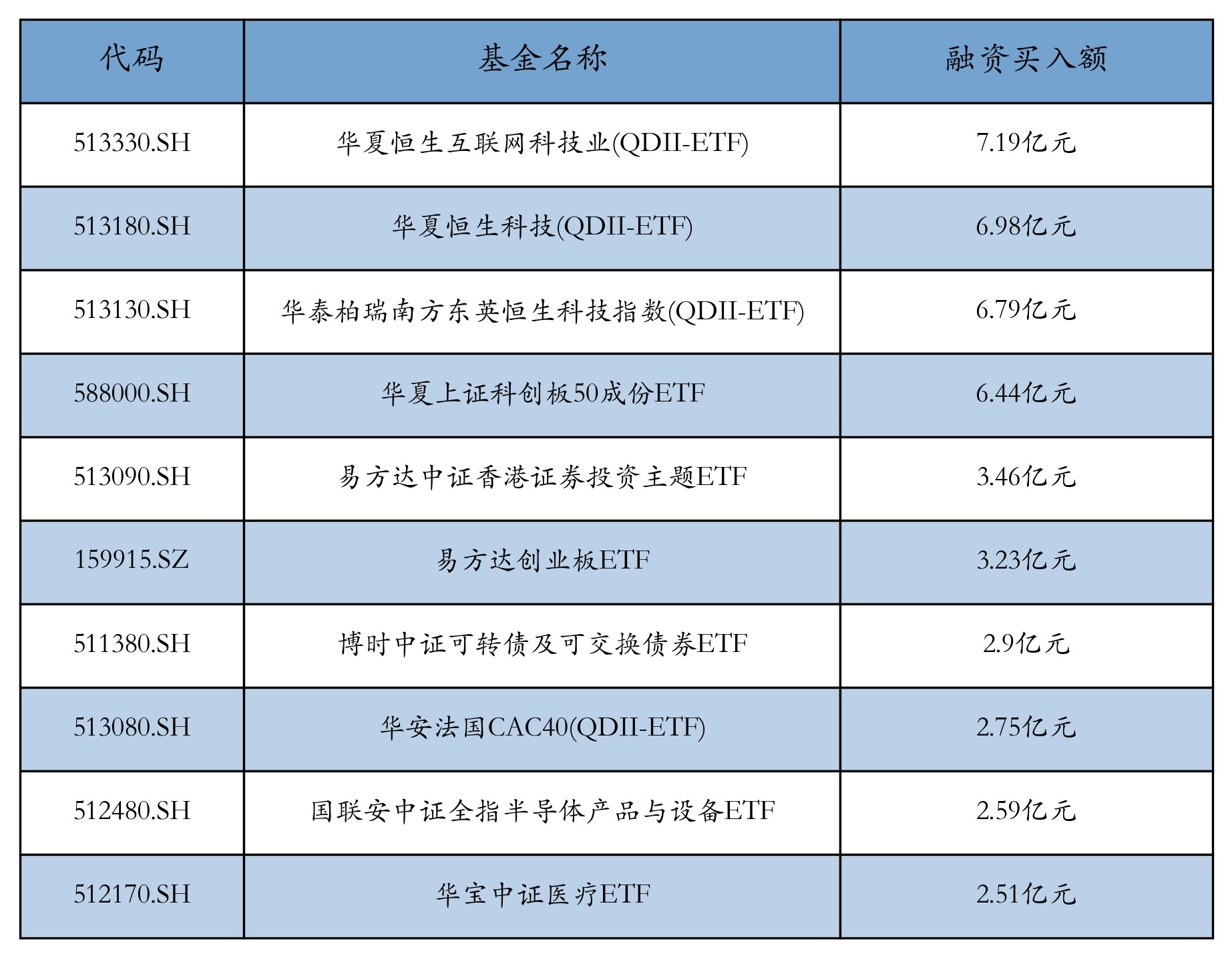 2月20日ETF融资买入额前三位分别为:华夏恒生互联网科技业(QDII-ETF)(7.19亿元)、华夏恒生科技(QDII-ETF)(6.98亿元)和华泰柏瑞南方东英恒生科技指数(QDII-ETF)(6.79亿元),前10具体见下表: